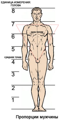 На рисунке изображены общепринятые (еще со времен Да Винчи) параметры гармонично сложенной мужской фигуры, на которой указаны пропорции (соотношение размеров) частей тела. Единицей измерения выбрана длина и ширина головы. Из рисунка видно, что важны не столько абсолютные показатели длины, сколько баланс между длинами частей тела.
