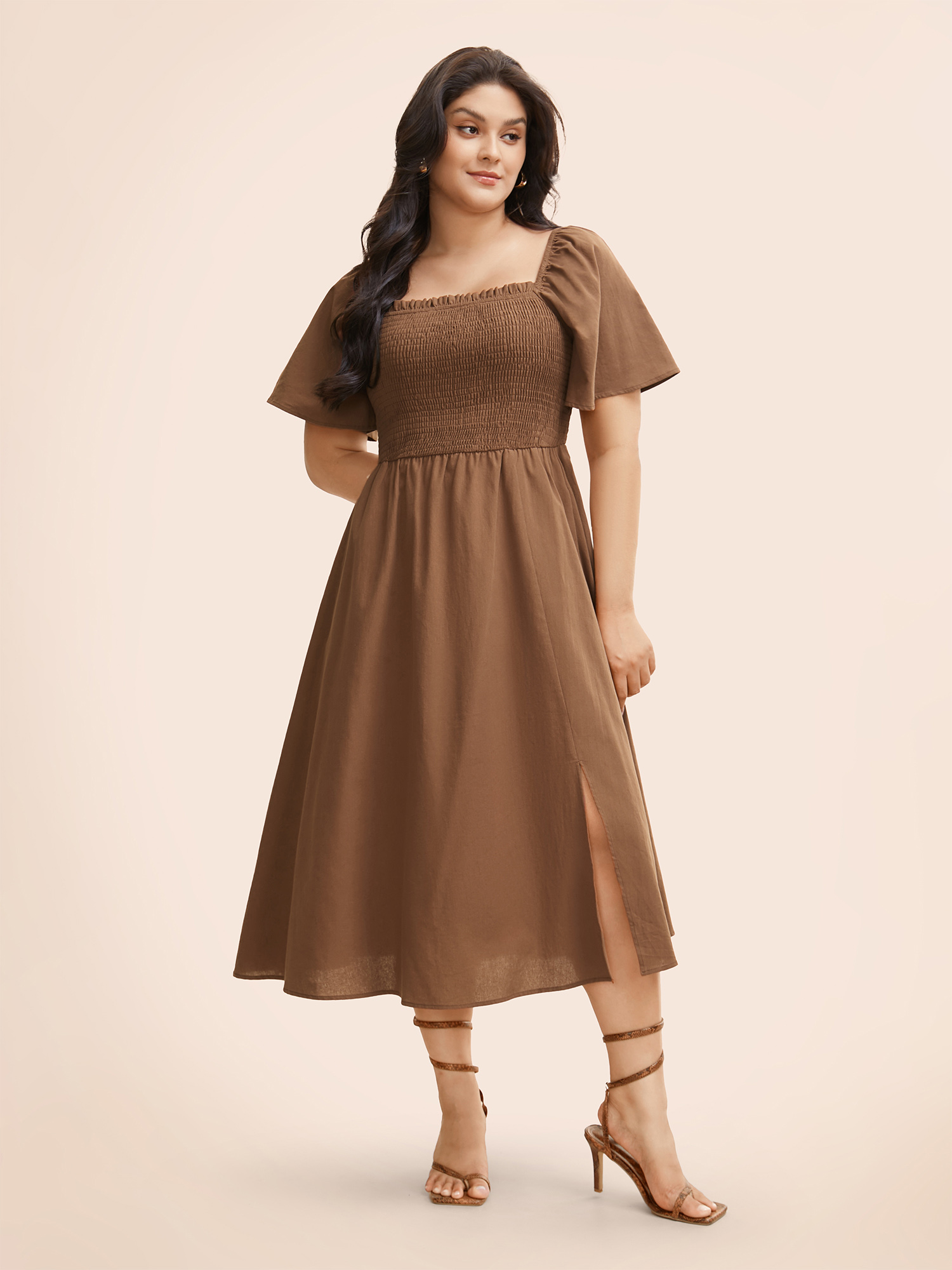 Plus Size Cotton Square Neck Shirred Ruffle Sleeve Split Hem Dress Browncoffeecolor Women Casual Gathered Square Neck Short sleeve Curvy BloomChic 14-16/1X BloomChic