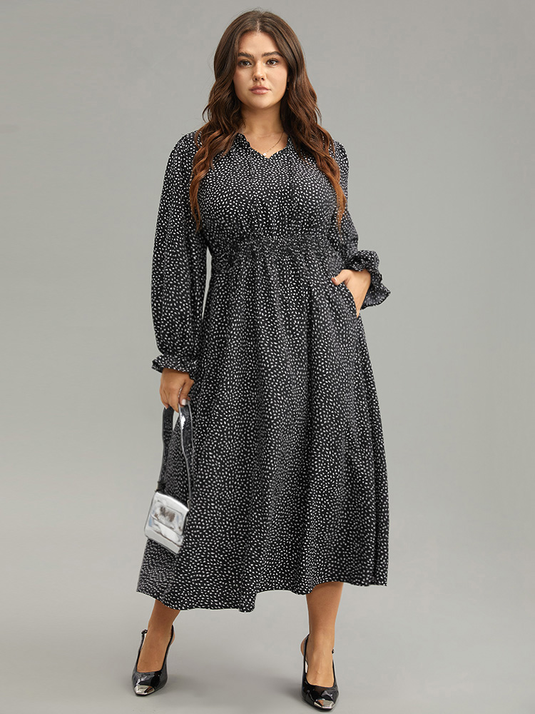 Plus Size Women Work Plain Elastic cuffs Lantern Sleeve Long Sleeve Notched collar Pocket Office Dresses BloomChic BloomChic