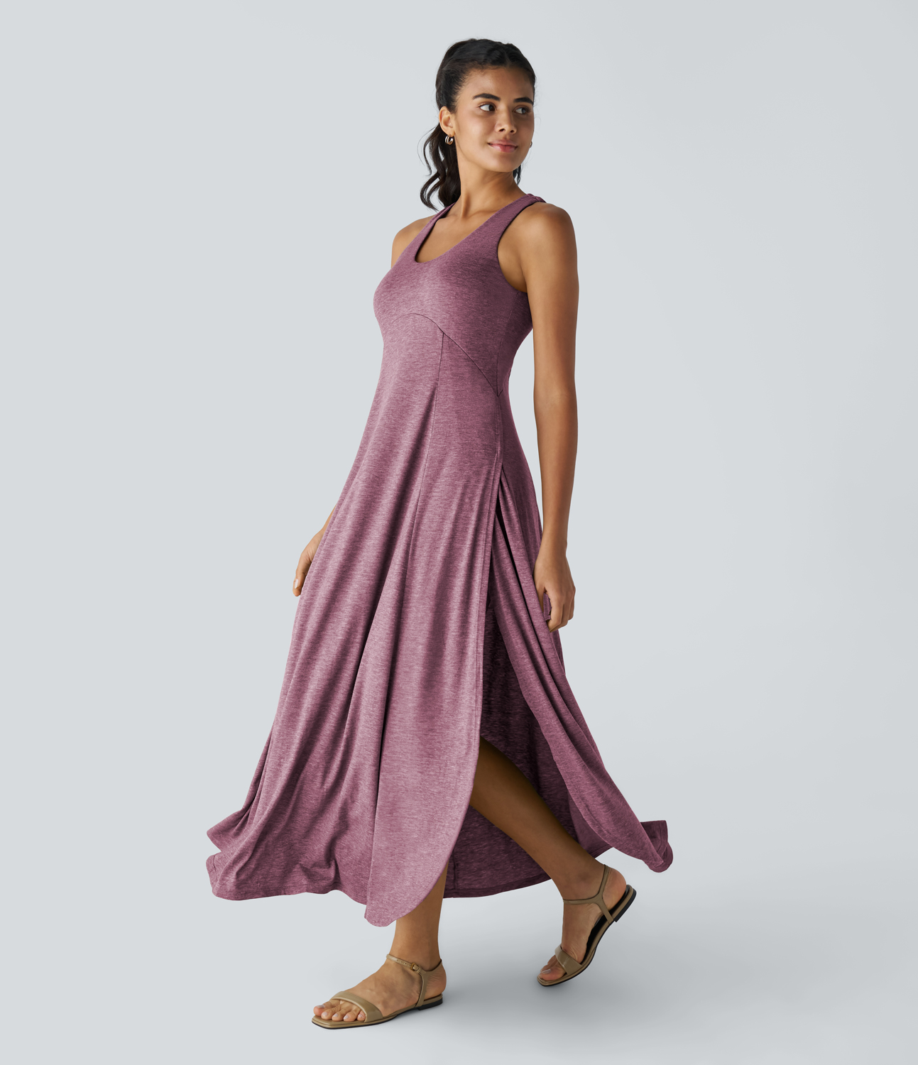 Halara U Neck Backless Split Flowy Maxi Casual Tank Dress Casual Dress - Deep Tea Brown Floral Yarn - XL slip dress beach dress ruched dress Halara