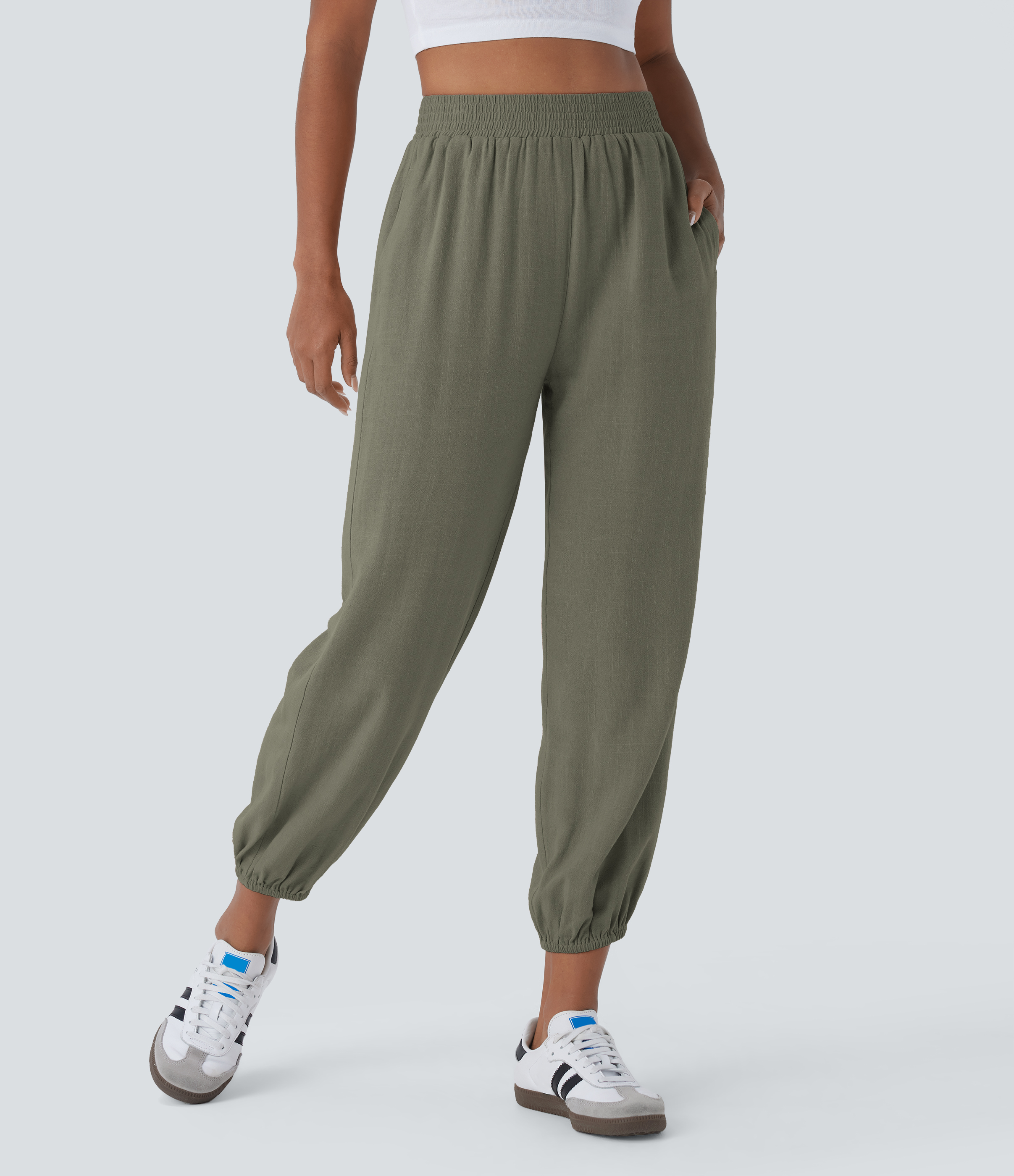 Halara High Waisted Side Pocket Linen-blend Casual Joggers - Dusty Olive - XL(regular) Halara