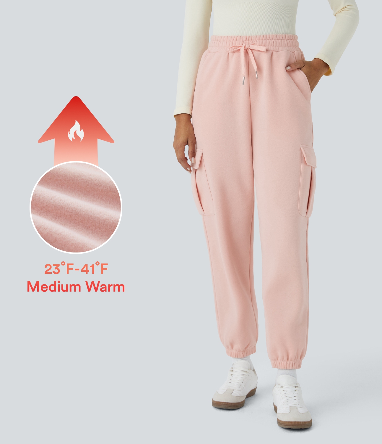 Halara High Waisted Drawstring Multiple Pockets Fleece Casual Pants - Peachy Keen - S(regular) Halara