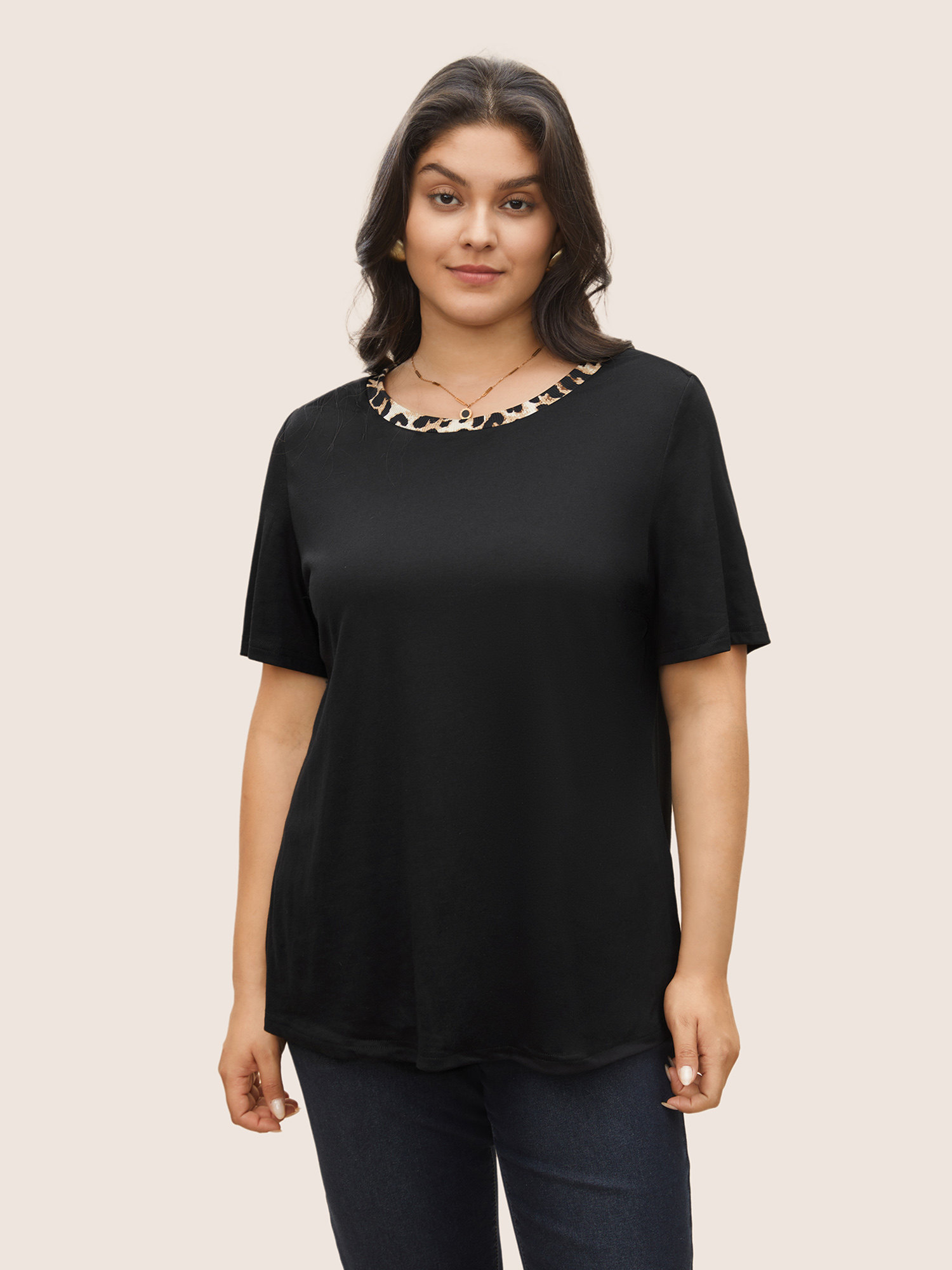 Plus Size Round Neck Leopard Print Patchwork T-shirt Black Women Casual Patchwork Leopard Round Neck Everyday T-shirts BloomChic 10/M BloomChic