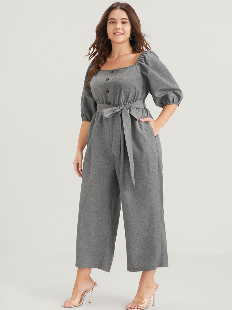 Plus Size Black Contrast Stitch Pocket Button Detail Belted Zipper Jumpsuit Women Office Short sleeve Square Neck Work Loose Jumpsuits BloomChic 22-24/3X BloomChic