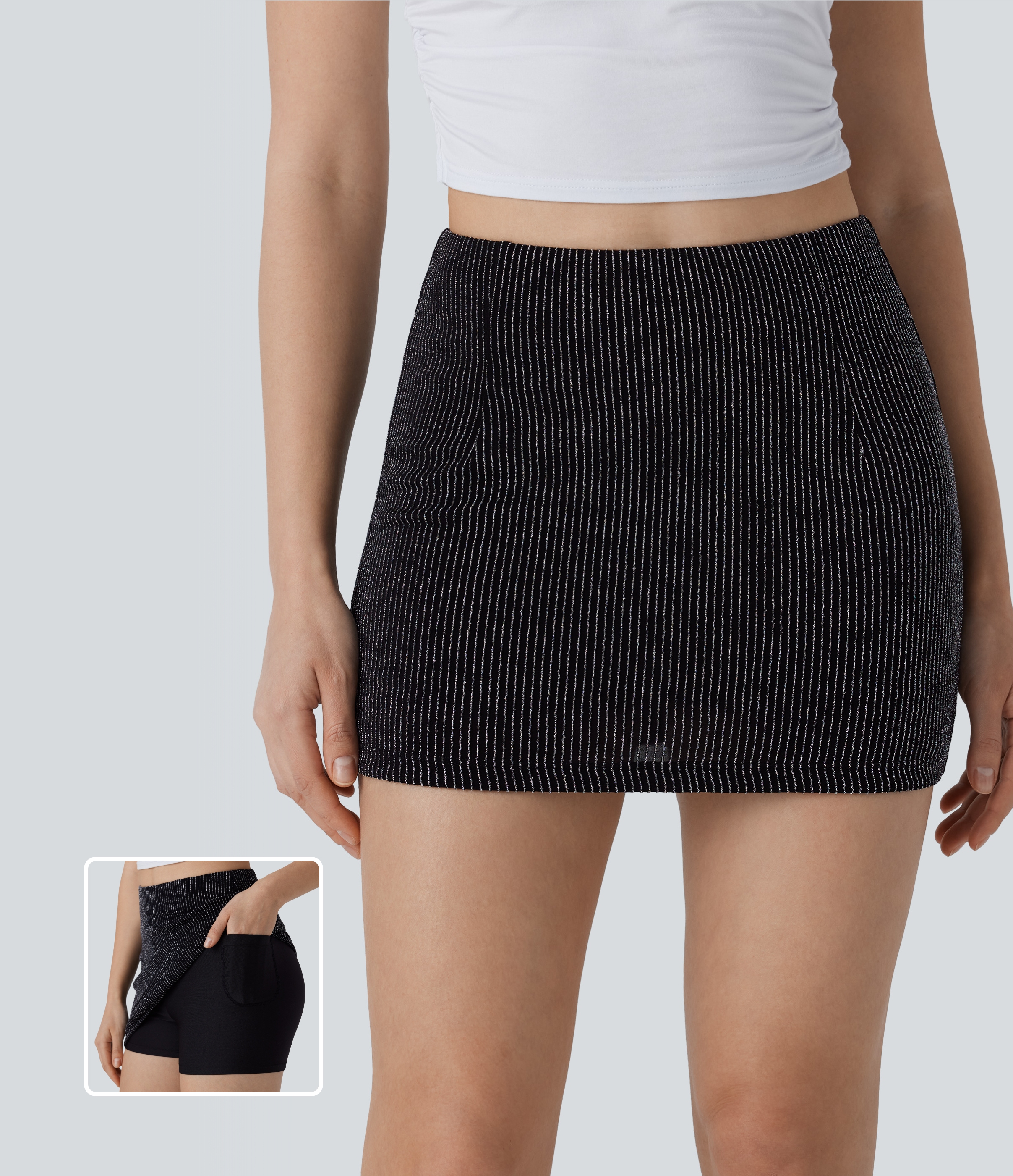 Halara High Waisted 2-in-1 Side Pocket Metallic Stripe Bodycon Mini Casual Skirt - Black White Starlight Stripe - L(regular) Halara