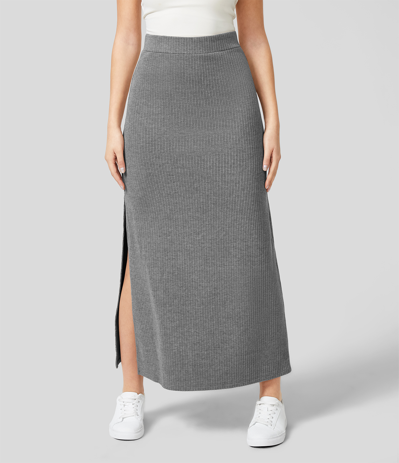 Halara Ribbed High Waisted Split Hem A Line Maxi Casual Skirt - Mockingbird - M(regular) Halara
