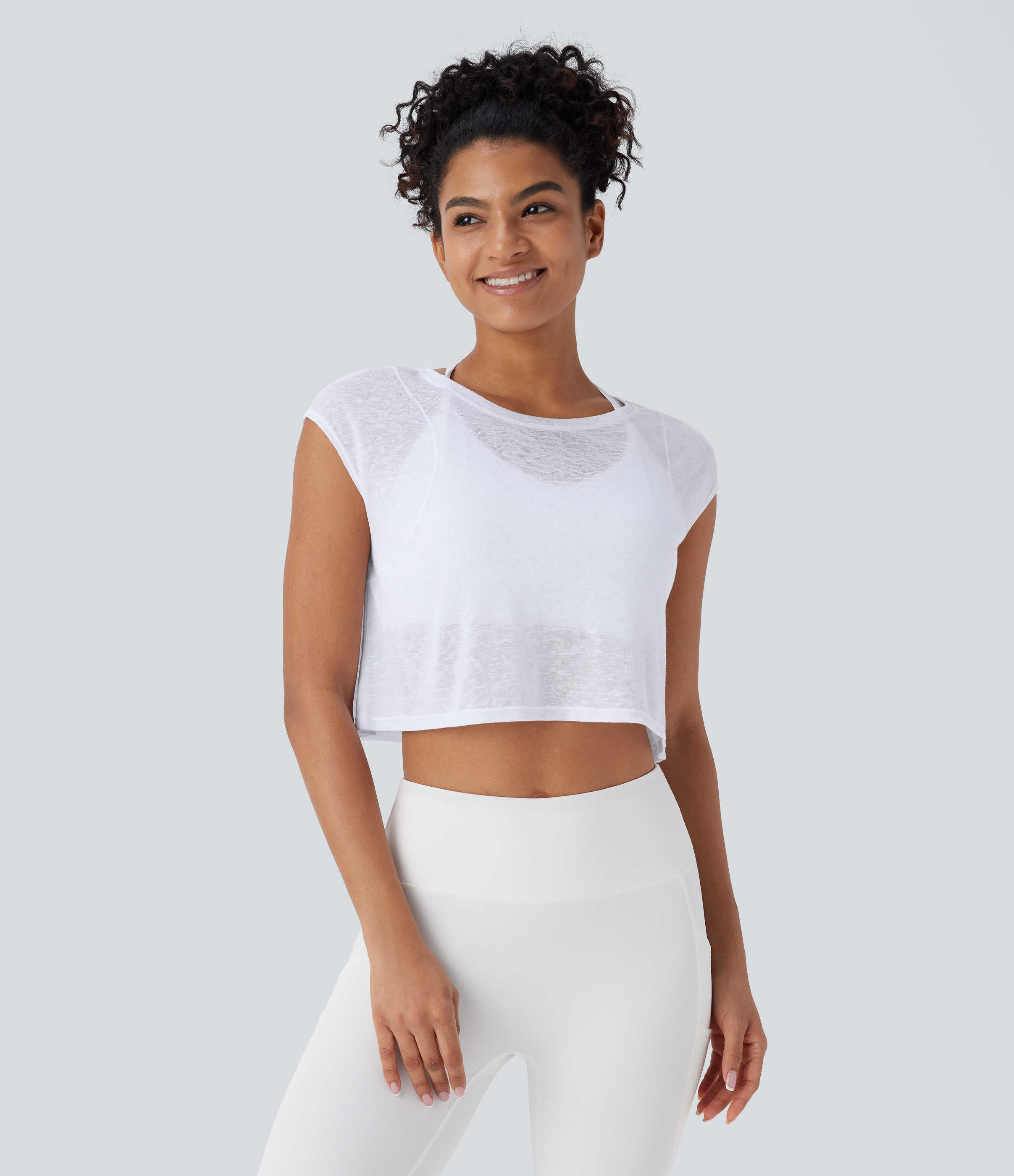 Halara Round Neck Cap Sleeve Cropped Yoga Sports Top - White - S Halara