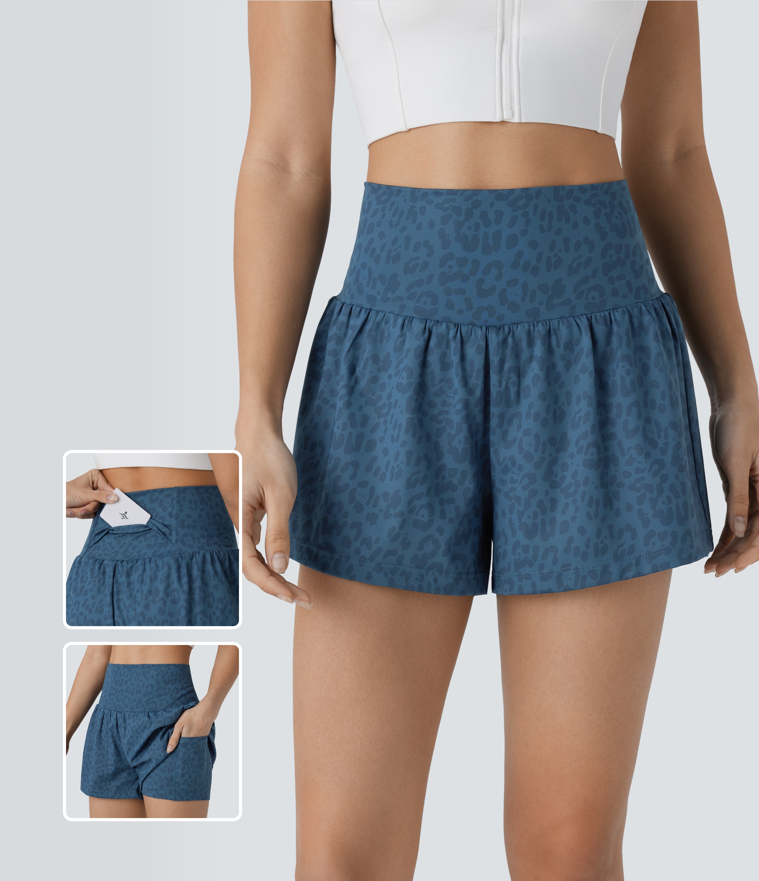 Halara Super High Waisted Back Pocket & Side Hidden Pocket 2-in-1 Leopard Print Yoga Shorts Gym Short - Lake Blue Leopard Print - L Halara