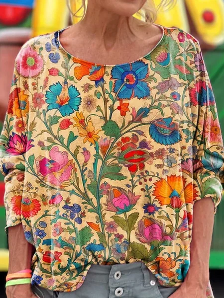 Women`s Long Sleeve Tee T-shirt Spring/Fall Floral Printing Crew Neck Casual Top T-Shirts JustFashionNow