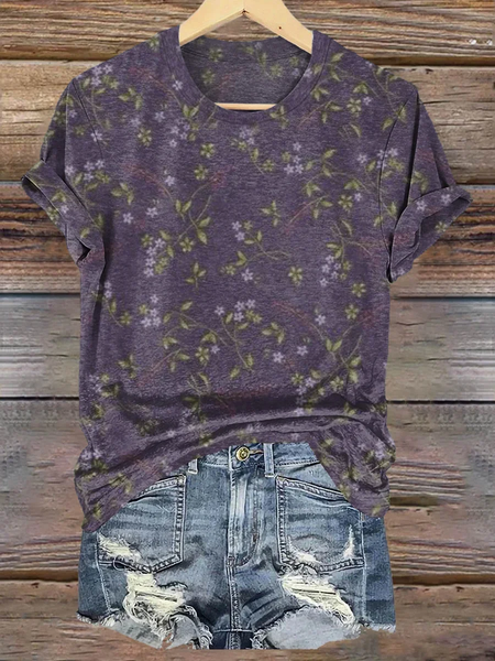 Casual Simple Floral Print Short Sleeve Crew Neck T-Shirt T-shirts Lilicloth