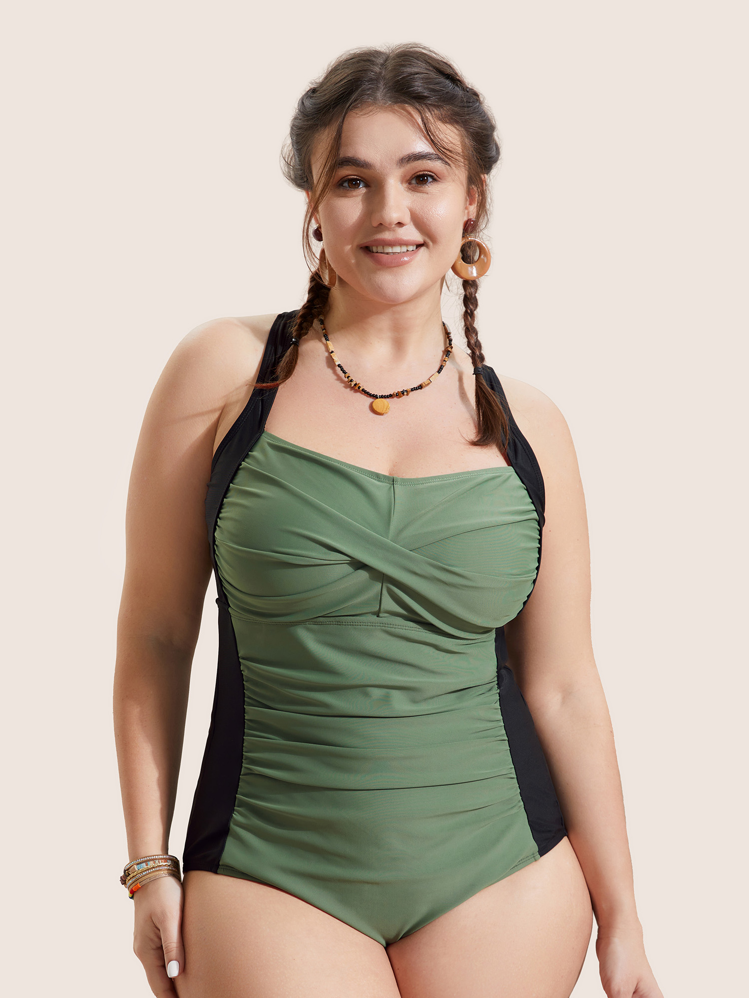 Plus Size Contrast Patchwork Twist Front One Piece Swimsuit Women`s Swimwear ArmyGreen Beach Twist Curve Bathing Suits High stretch One Pieces BloomChic 30/6X BloomChic