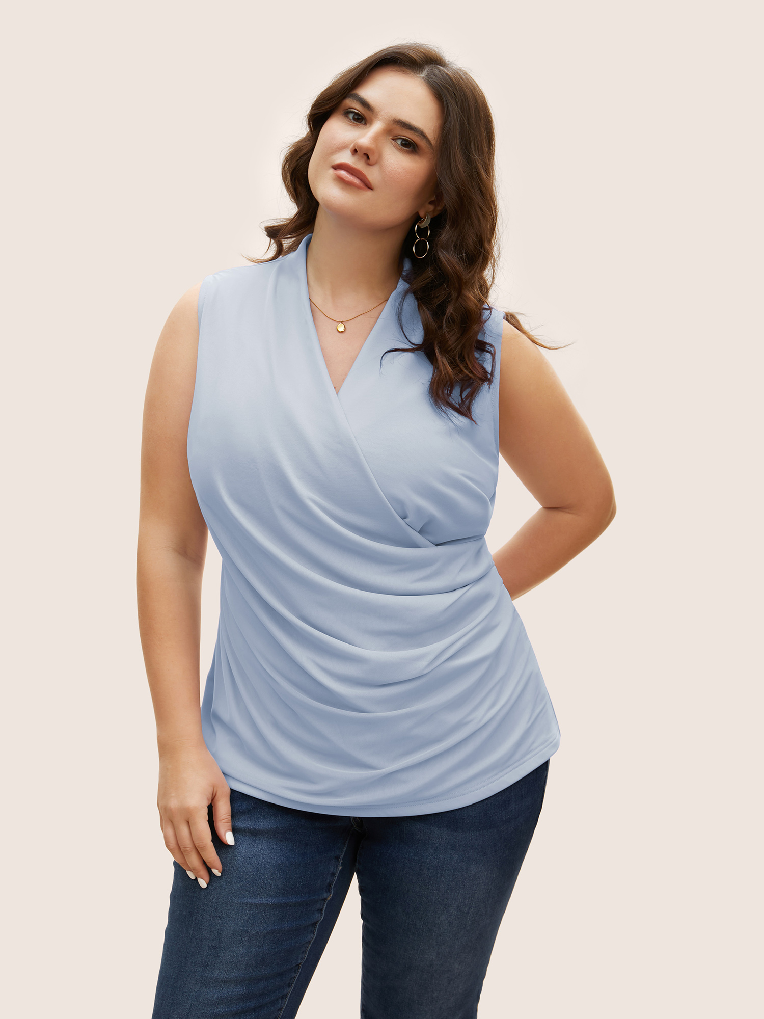 Plus Size Overlap Collar Solid Pleated Tank Top Women LightBlue Elegant Pleated Overlap Collar Everyday Tank Tops Camis BloomChic 18-20/2X BloomChic
