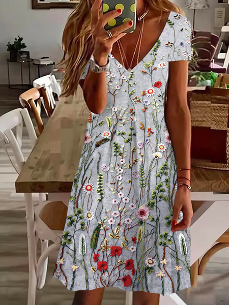 Elegant V Neck Floral Swing Dress Formal Dresses JustFashionNow