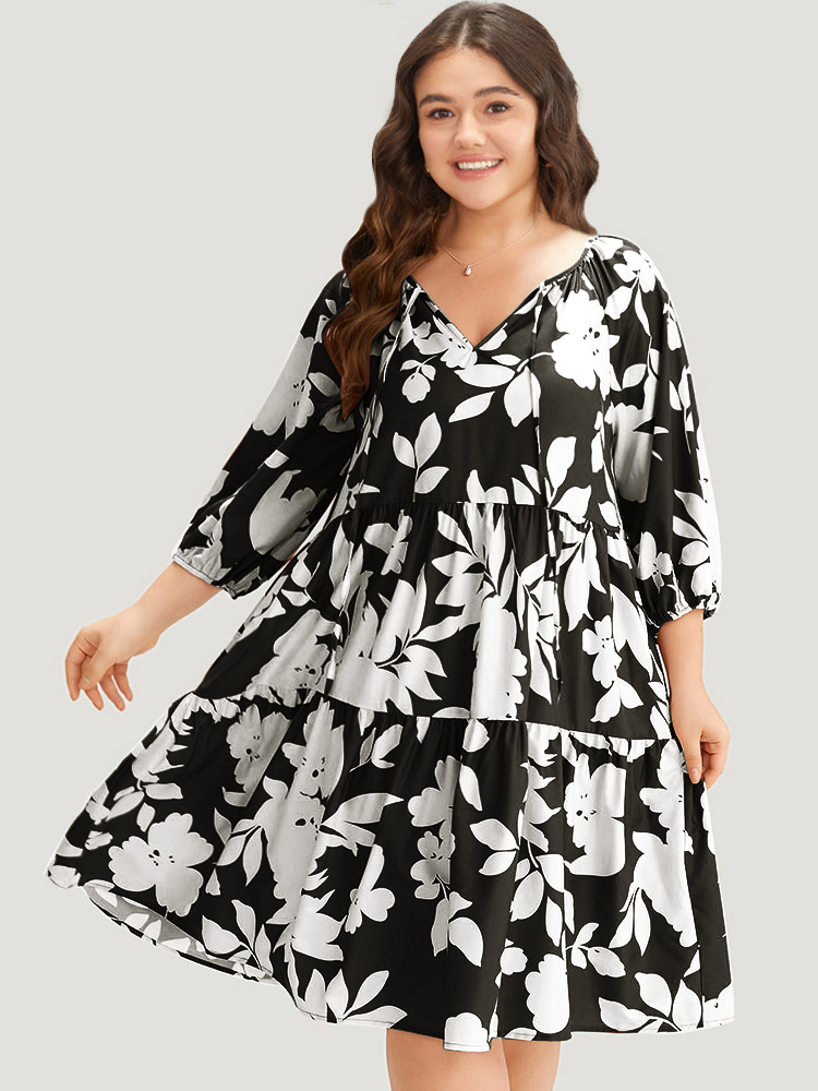 Plus Size Women Dailywear Plain Tiered Lantern Sleeve Long Sleeve V-neck Pocket Elegant Dresses BloomChic BloomChic