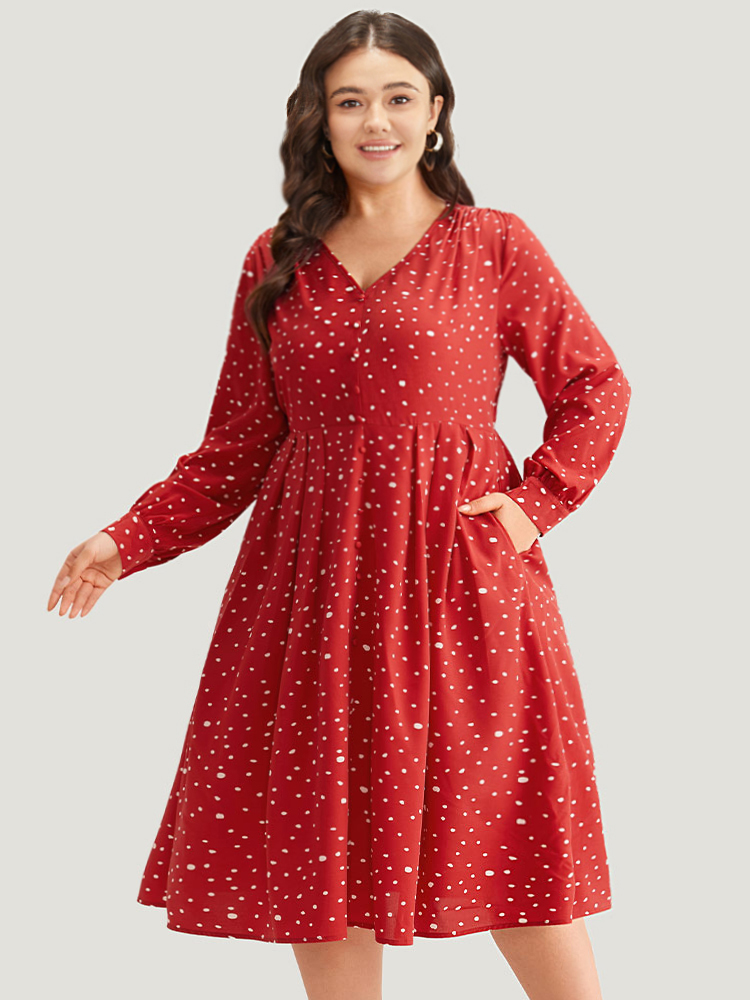 Plus Size Polka Dot Button Detail Pleated Dress Crimson Women Elegant Printed V-neck Long Sleeve Curvy Midi Dress BloomChic 10/M BloomChic