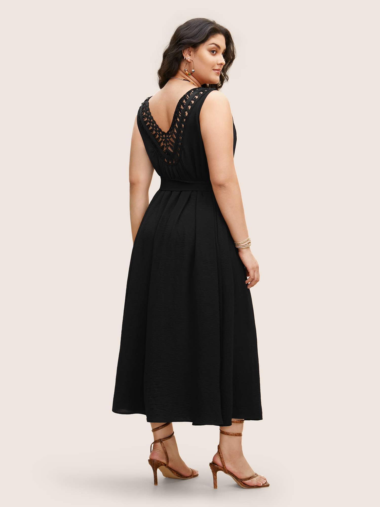 Plus Size Solid Crocheted Backless Sleeveless Midi Dress Black Women Woven ribbon&lace trim Round Neck Sleeveless Curvy BloomChic 10/M BloomChic
