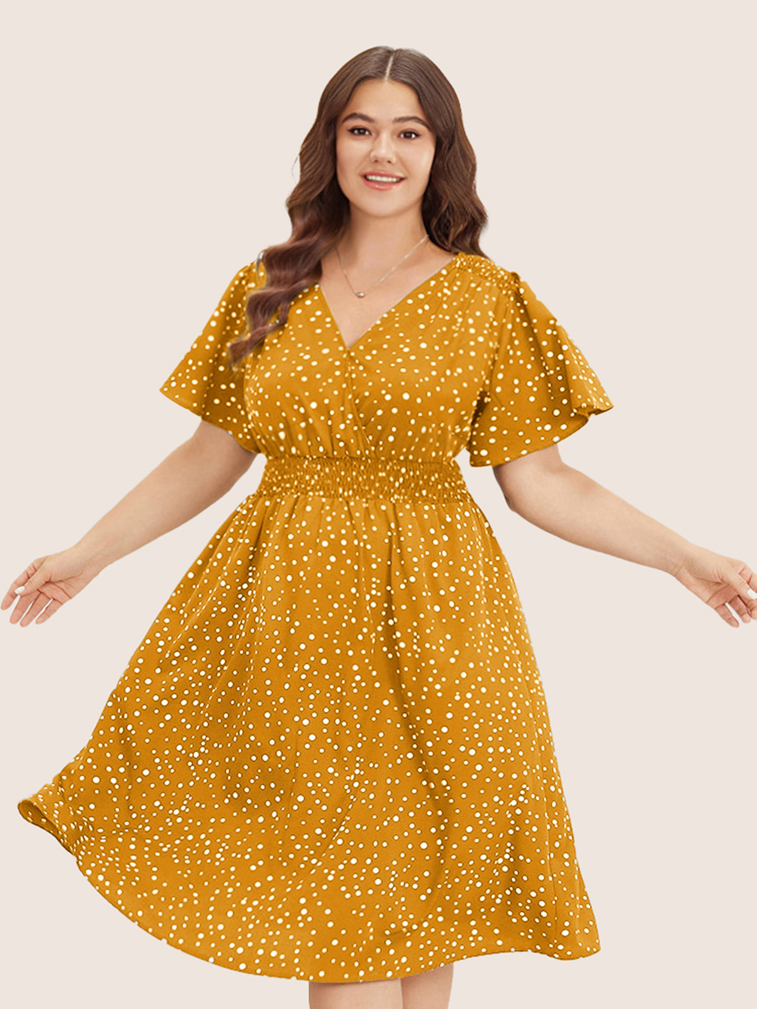 Plus Size Polka Dot Wrap Pocket Shirred Ruffle Sleeve Dress Yellow Women Elegant Patchwork V-neck Short sleeve Curvy Midi Dress BloomChic 12/L BloomChic