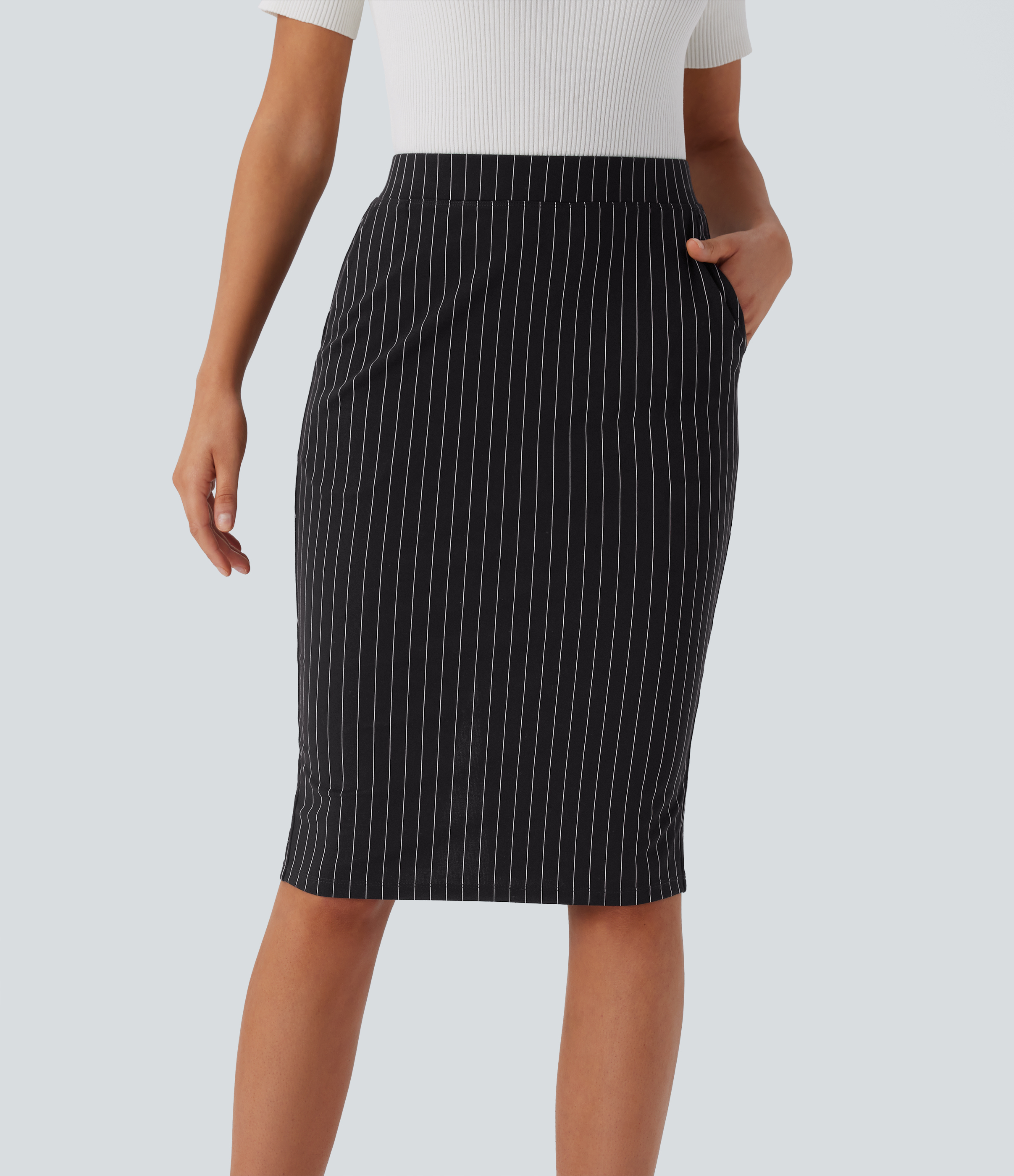 Halara High Waisted Side Pocket Split Hem Cool Touch Stripe Bodycon Work Skirt - Black White Pinstripe - XL(regular) Halara
