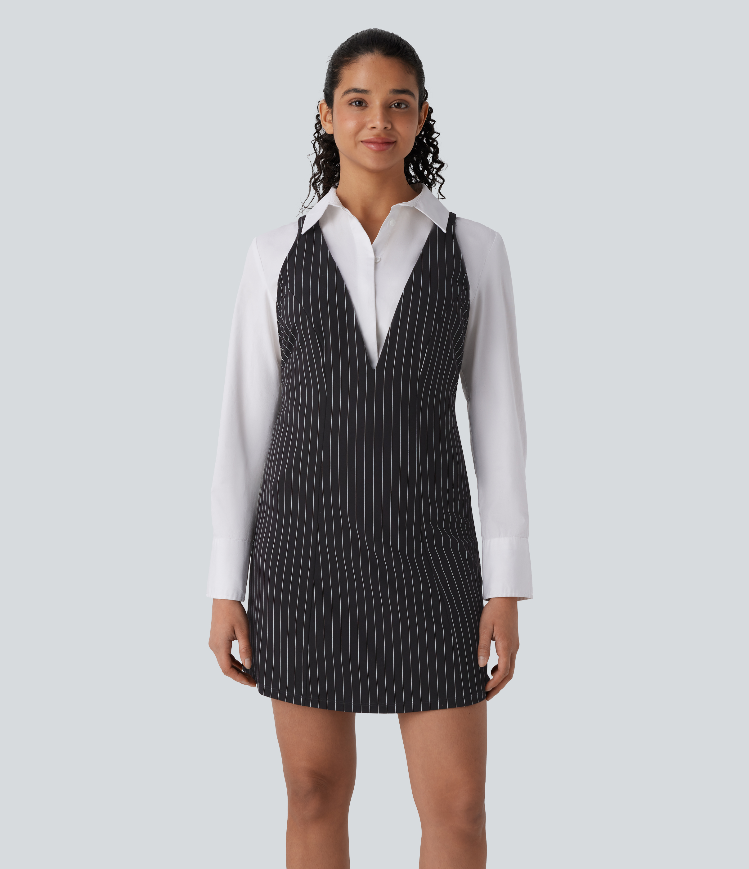 Halara V Neck Adjustable Strap Button Stripe Cool Touch Mini Work Dress Casual Dress - Black White Pinstripe - M slip dress beach dress Halara