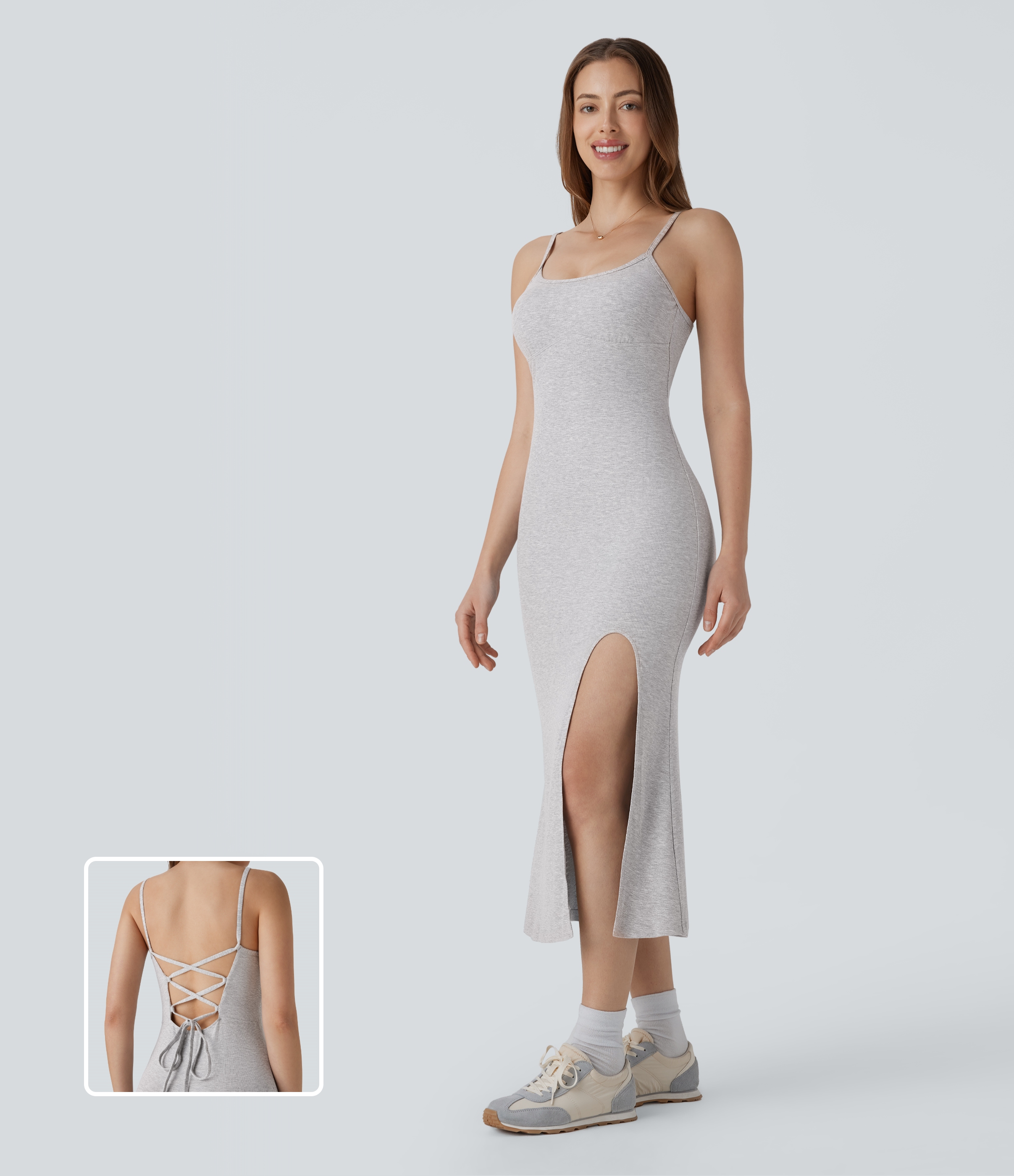 Halara Backless Adjustable Strap Frill Lace Up Invisible Zipper Midi Resort Slip Dress Casual Dress - Light Pink White Stripe - XL slip dress Halara