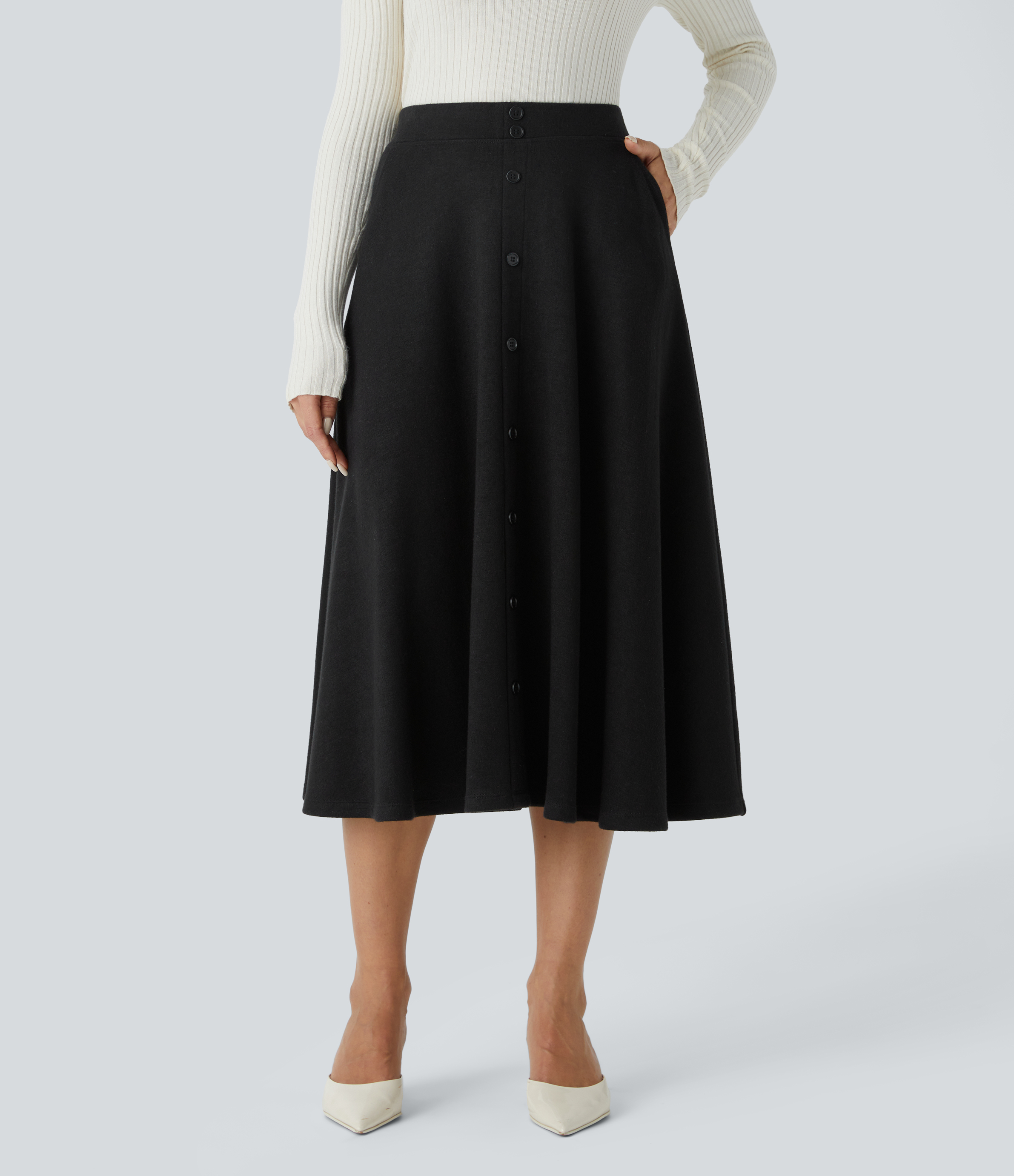 Halara High Waisted Decorative Button Side Pocket Midi Flare Casual Skirt - Black - XL(regular) Halara