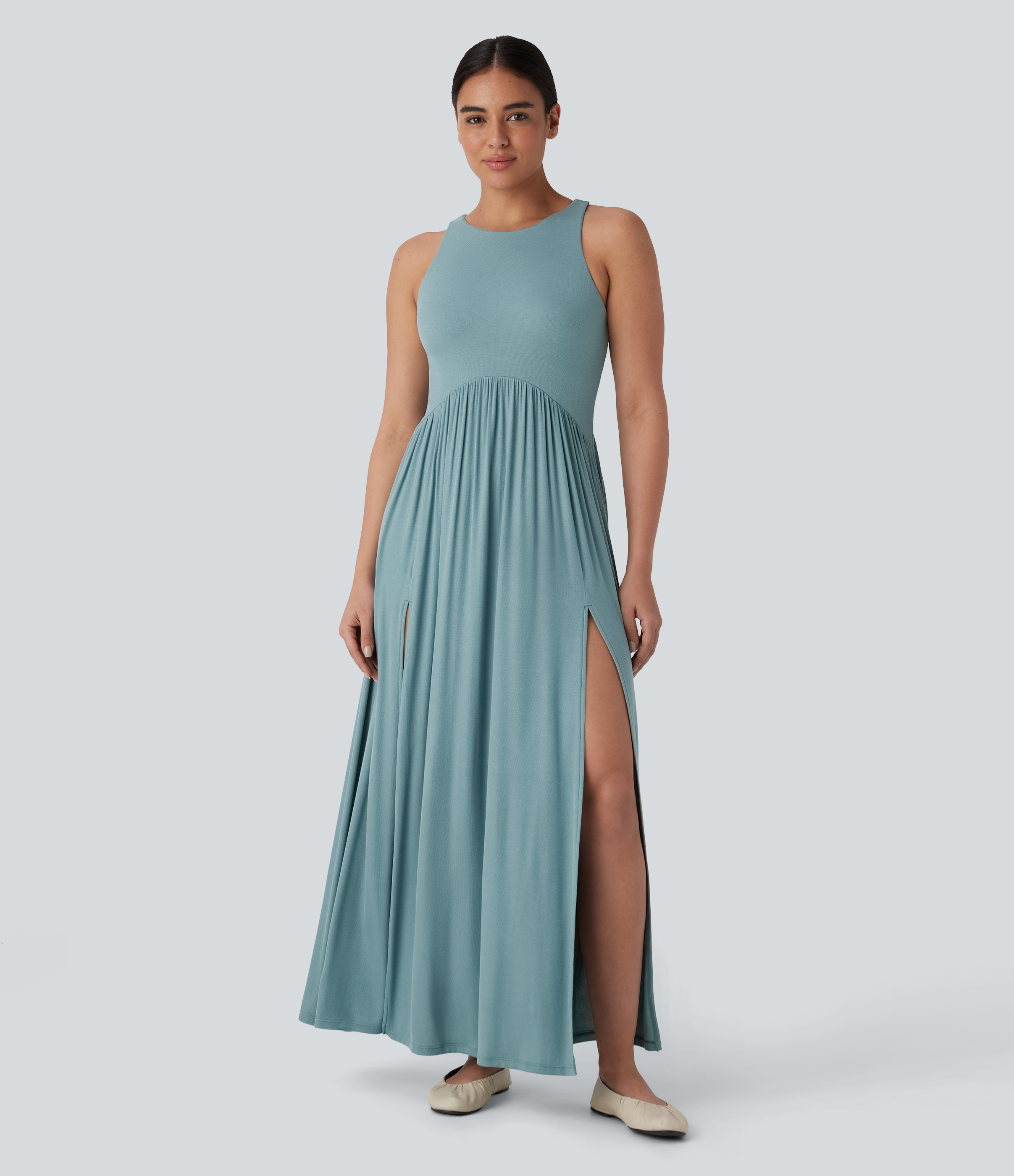Halara U Neck Backless Split Flowy Maxi Casual Tank Dress Casual Dress - Sky Blue Floral Yarn - M slip dress beach dress ruched dress Halara