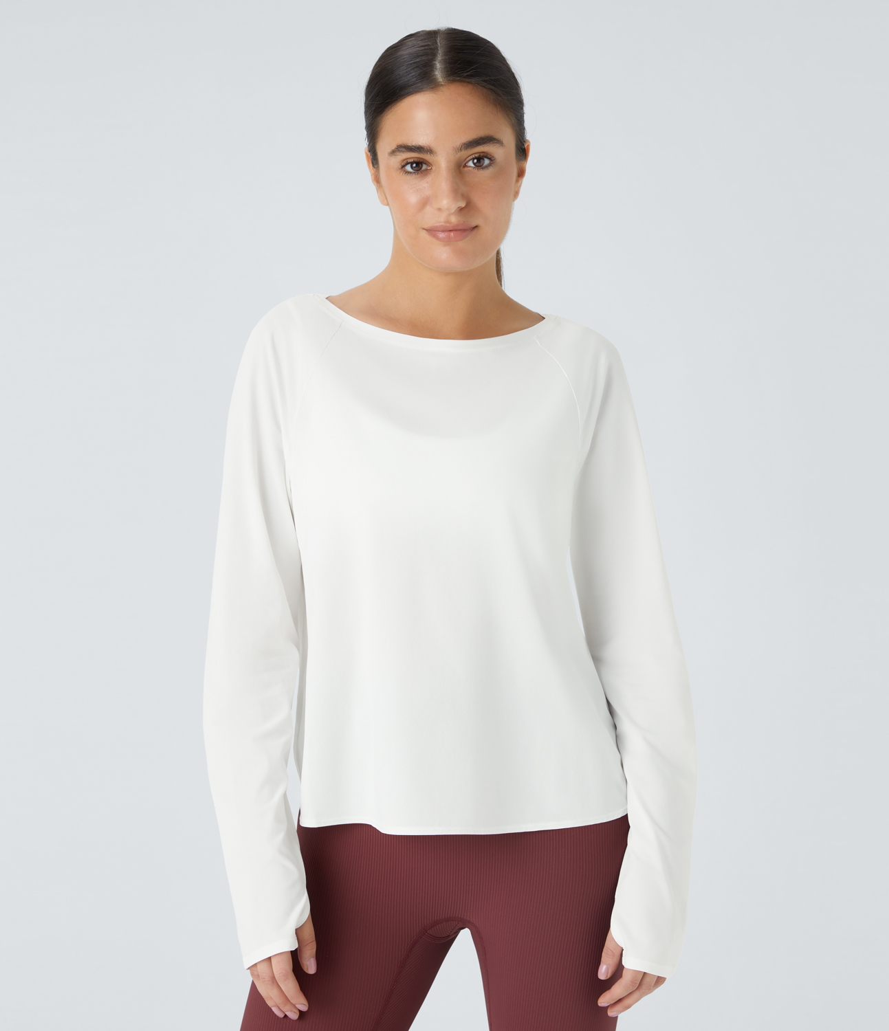 Halara Scoop Neck Raglan Sleeve Ruched Curved Hem Slim Yoga Sports Top - Bleached Denim - S Halara