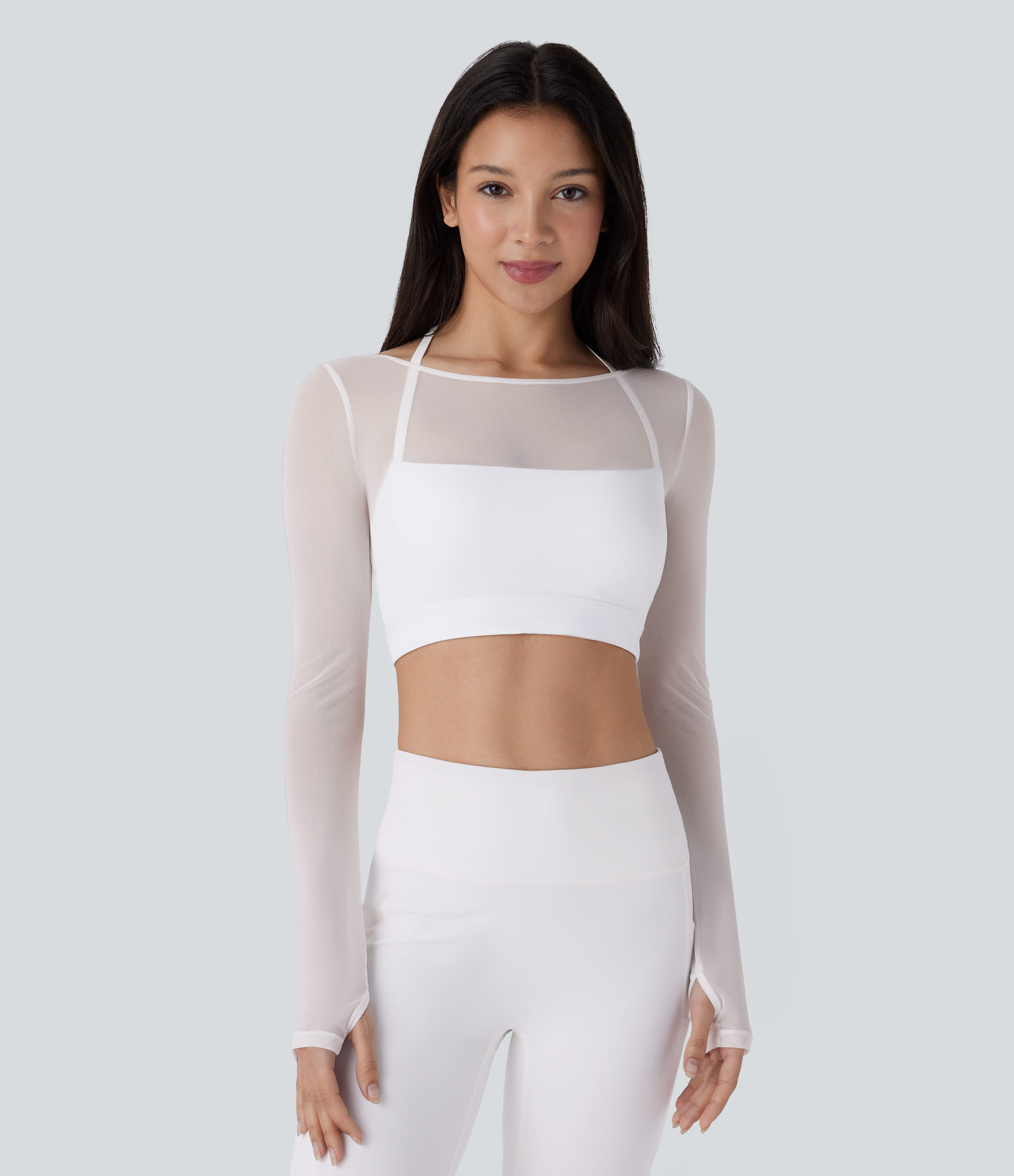 Halara Softlyzeroв„ў Square Neck Thumb Hole Corset Mesh Cropped Yoga Sports Top - Chestnut Brown - L Halara