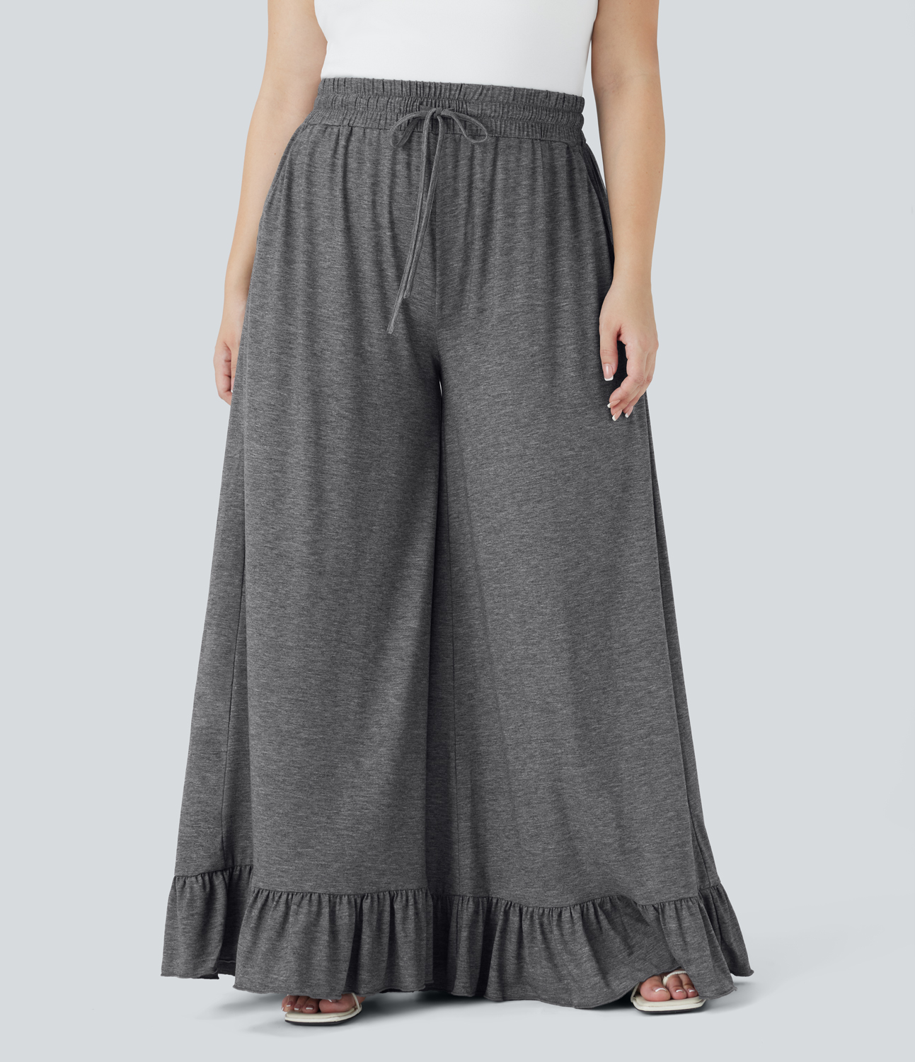 Halara High Waisted Drawstring Side Pocket Ruffle Wide Leg Casual Plus Size Pants - Darl Gray Floral Yarn - 2X(regular) Halara