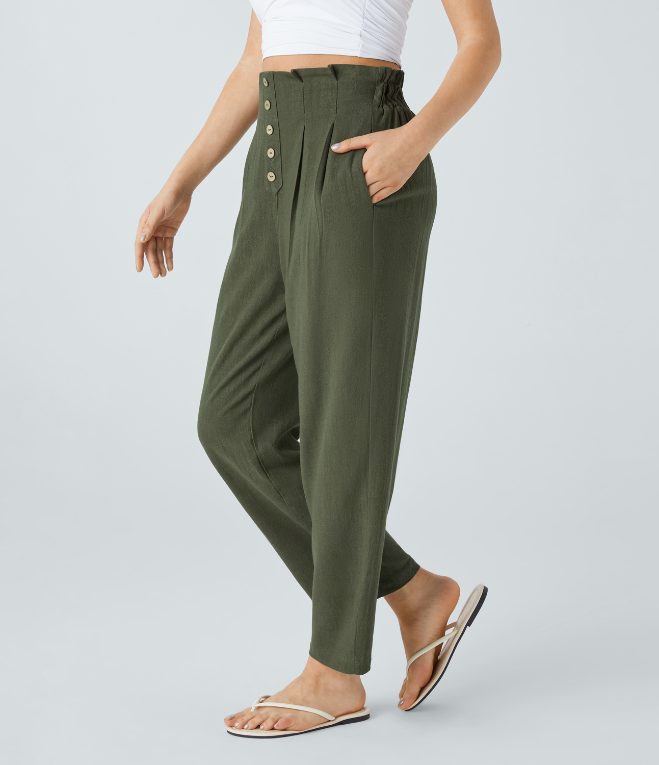 Halara Paper Bag Waist Decorative Button Side Pocket Linen-Blend Resort Tapered Pants - Beachgrass Green - S(regular) sweatpants Halara