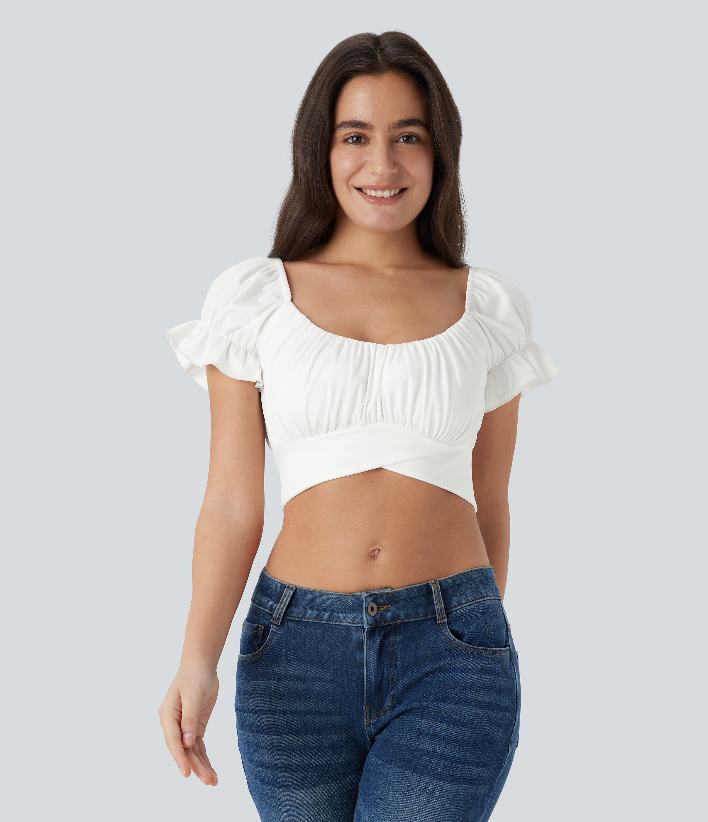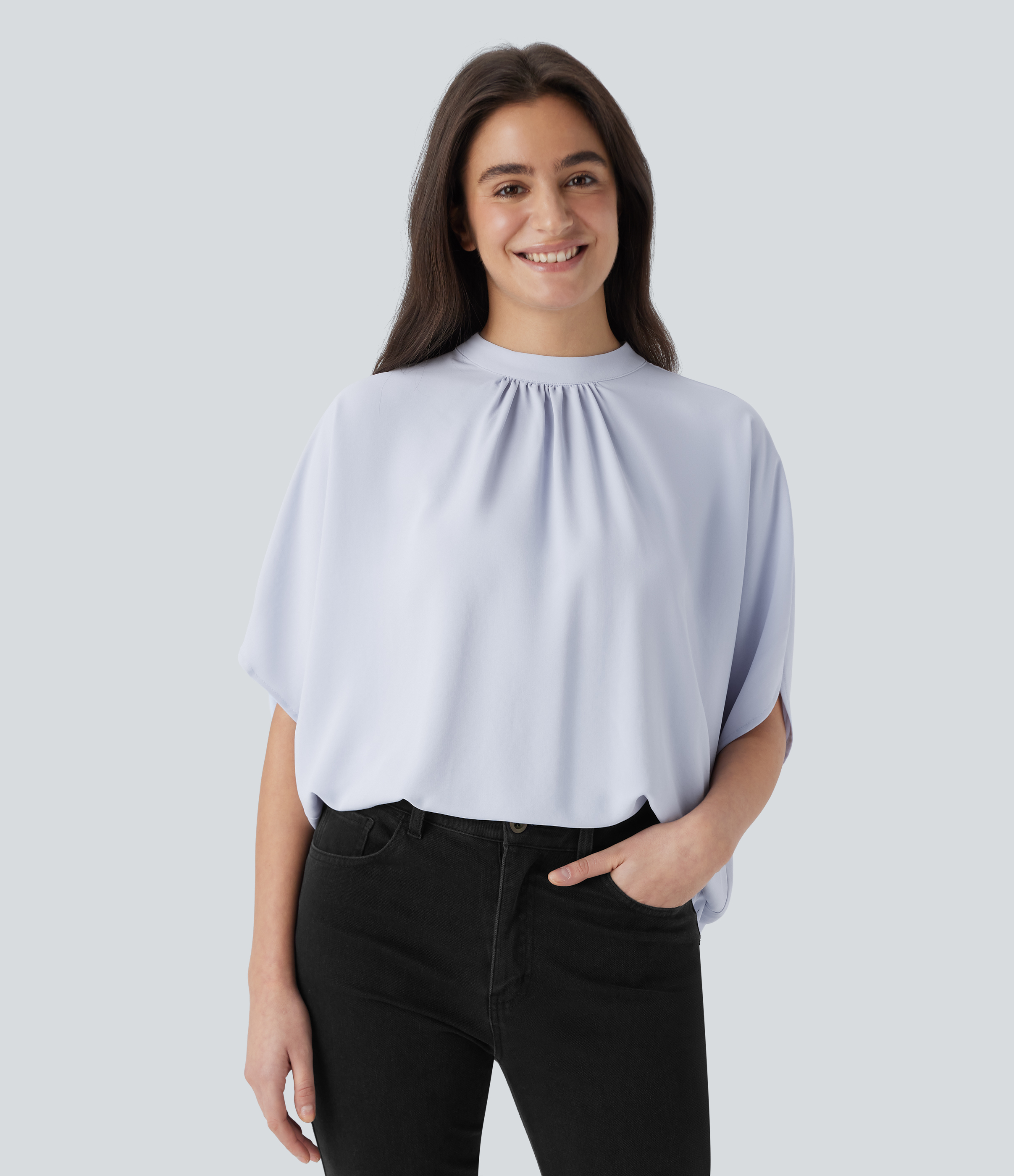 Halara Round Neck Short Sleeve Ruched Skinny Cropped Casual T-Shirt - Fog Gray - XS Halara