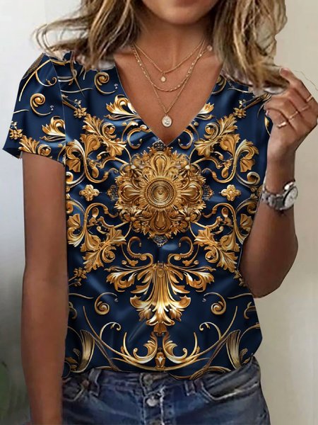Women`s Short Sleeve Tee T-shirt Summer Ethnic Jersey V Neck Holiday Going Out Casual Top T-Shirts JustFashionNow